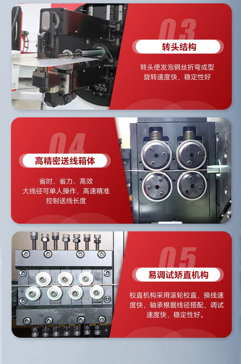 產品特點:調試和切換產品更方便,無需頻繁更換工裝夾具,成形空間更靈活;產品通過頭部旋轉成型產品,可成型100-600mm長鋼絲件及不對稱產品(汽車發泡鋼絲);頭部旋轉設計根據產品特定,可靈活高速旋轉,提高產品生產效率。