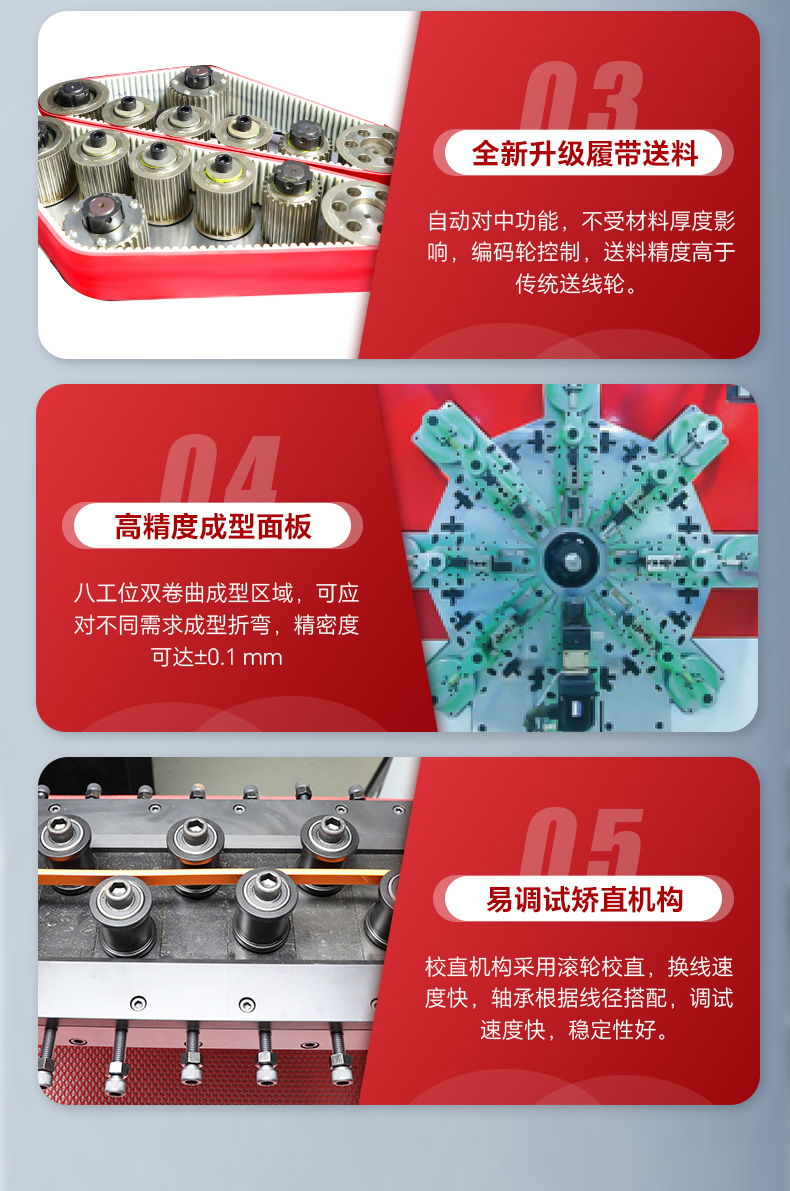 3、履帶送料,具備自動對中功能,不受材料厚度影響,直接使用;同時安裝編碼輪控制,送料精度高于傳統送線輪。